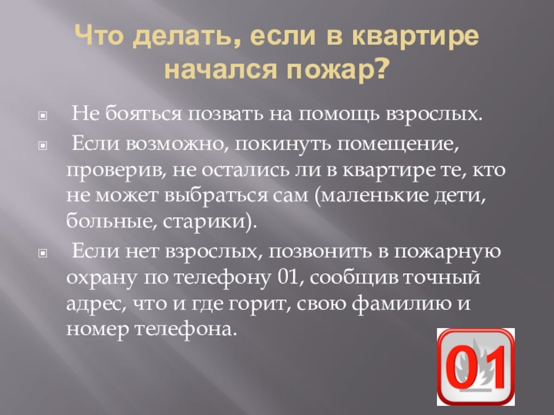 Если нет взрослых, позвонить в пожарную охрану по телефону 01, сообщив точный адрес, что и где горит, свою фамилию и номер телефона.