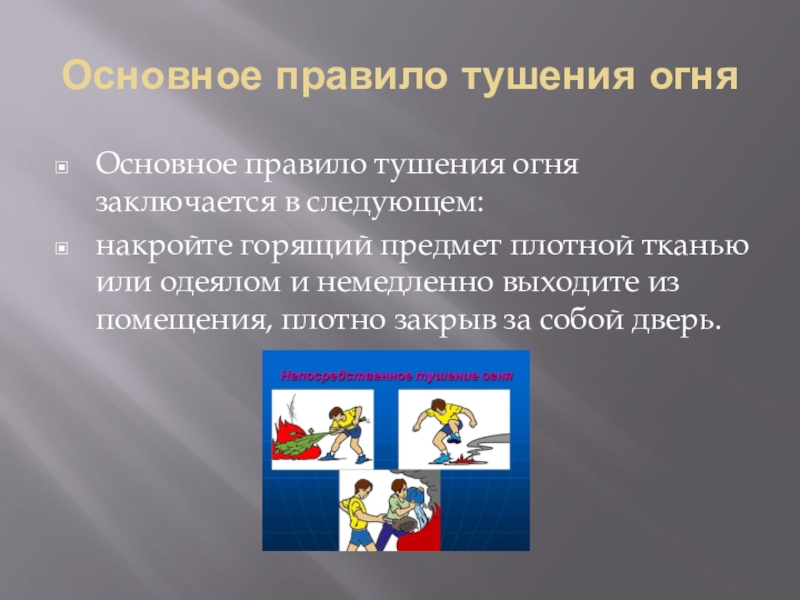 Основное правило тушения огняОсновное правило тушения огня заключается в следующем: накройте горящий предмет плотной тканью или одеялом