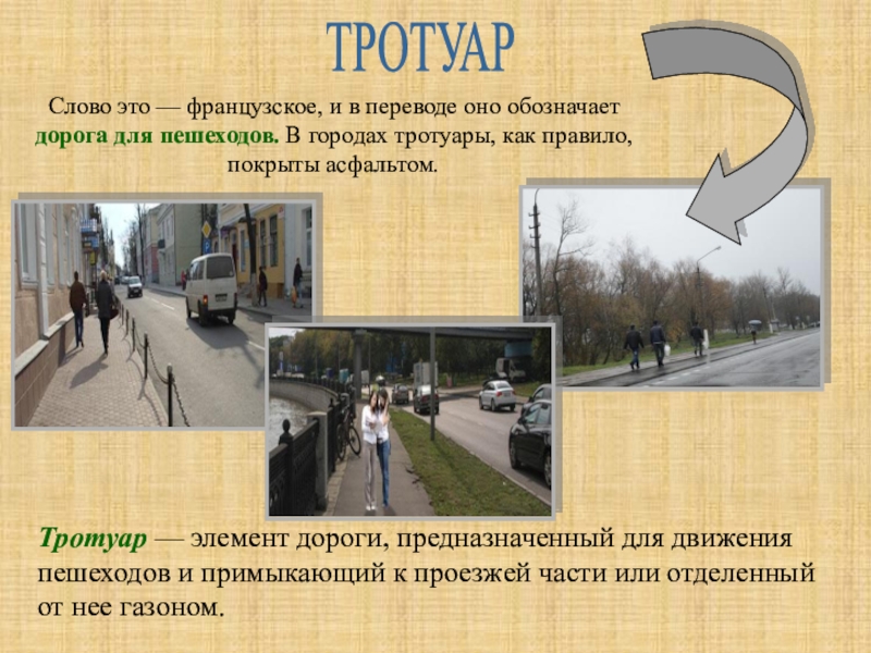 Слово это — французское, и в переводе оно обозначает дорога для пешеходов. В городах тротуары, как правило, покрыты асфальтом.