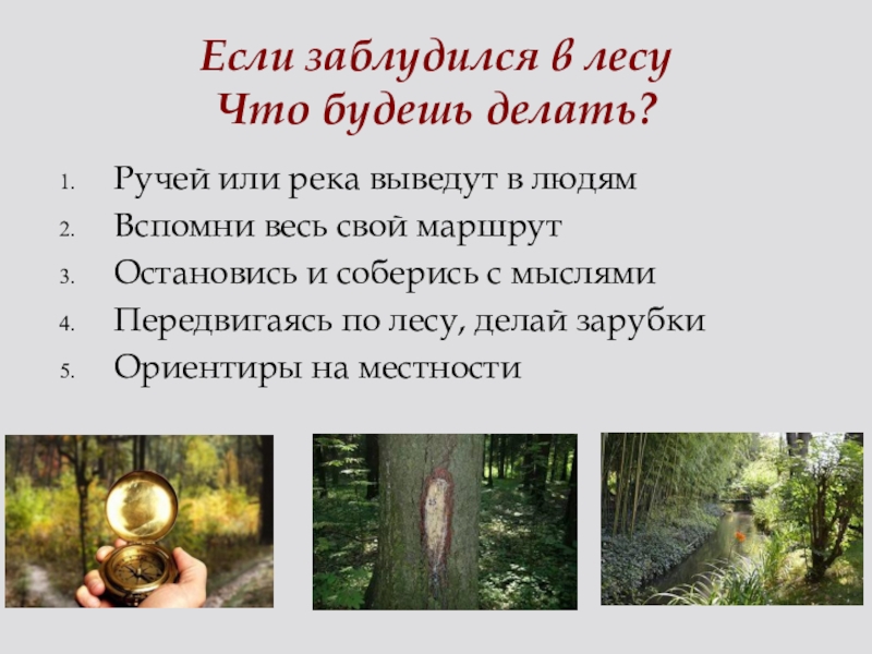 Если заблудился в лесу Что будешь делать?Ручей или река выведут в людямВспомни весь свой маршрутОстановись и соберись