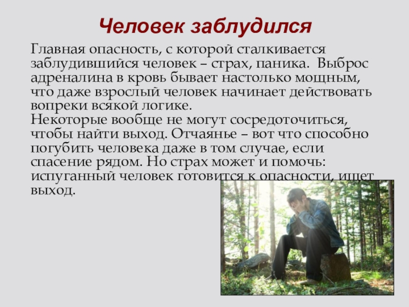 Человек заблудился  Главная опасность, с которой сталкивается заблудившийся человек – страх, паника. Выброс адреналина в кровь