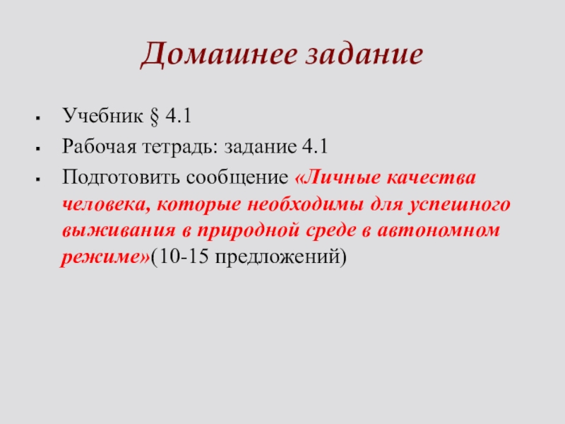 Домашнее заданиеУчебник § 4.1Рабочая тетрадь: задание 4.1Подготовить сообщение «Личные качества человека, которые необходимы для успешного выживания в