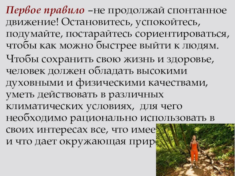Слайд 11Первое правило –не продолжай спонтанное движение! Остановитесь, успокойтесь, подумайте, постарайтесь сориентироваться,