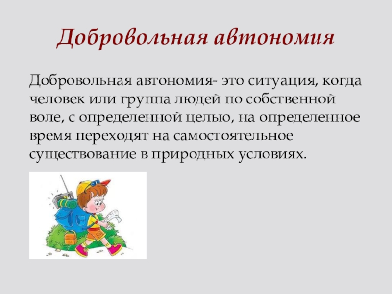 Добровольная автономияДобровольная автономия- это ситуация, когда человек или группа людей по собственной воле, с определенной целью, на