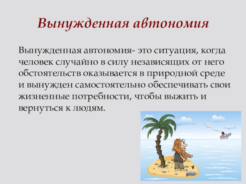 Вынужденная автономияВынужденная автономия- это ситуация, когда человек случайно в силу независящих от него обстоятельств оказывается в природной