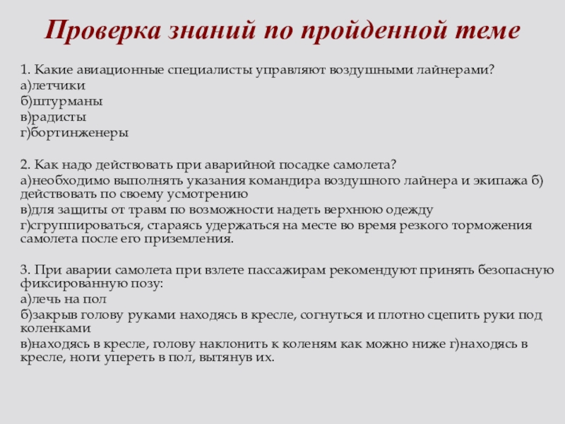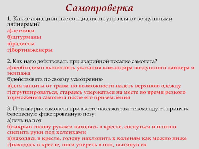 Самопроверка1. Какие авиационные специалисты управляют воздушными лайнерами? а)летчики б)штурманы в)радисты г)бортинженеры2. Как надо действовать при аварийной посадке самолета? а)необходимо выполнять указания командира воздушного лайнера и экипажа б)действовать по своему усмотрению в)для защиты от травм по возможности