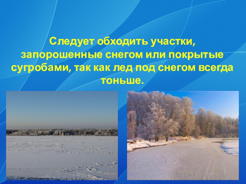 Слайд 4Следует обходить участки, запорошенные снегом или покрытые сугробами, так как лед