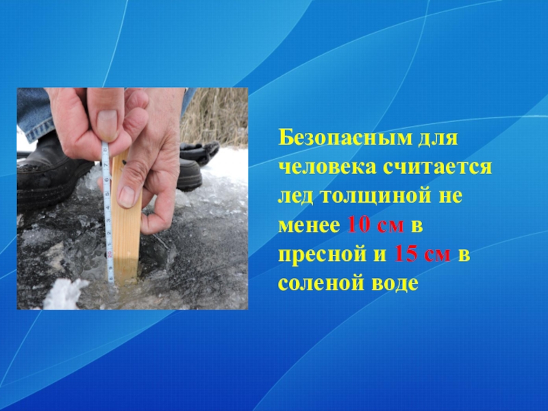 Слайд 11Безопасным для человека считается лед толщиной не менее 10 см в