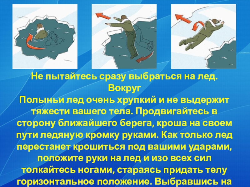 не выдержит тяжести вашего тела. Продвигайтесь в сторону ближайшего берега, кроша на своем пути ледяную кромку руками. Как только лед перестанет крошиться под вашими ударами, положите руки на лед и изо всех сил толкайтесь ногами, стараясь придать телу горизонтальное положение. Выбравшись на лед, распластайтесь и ползите к берегу