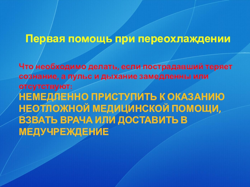 Слайд 23Первая помощь при переохлаждении