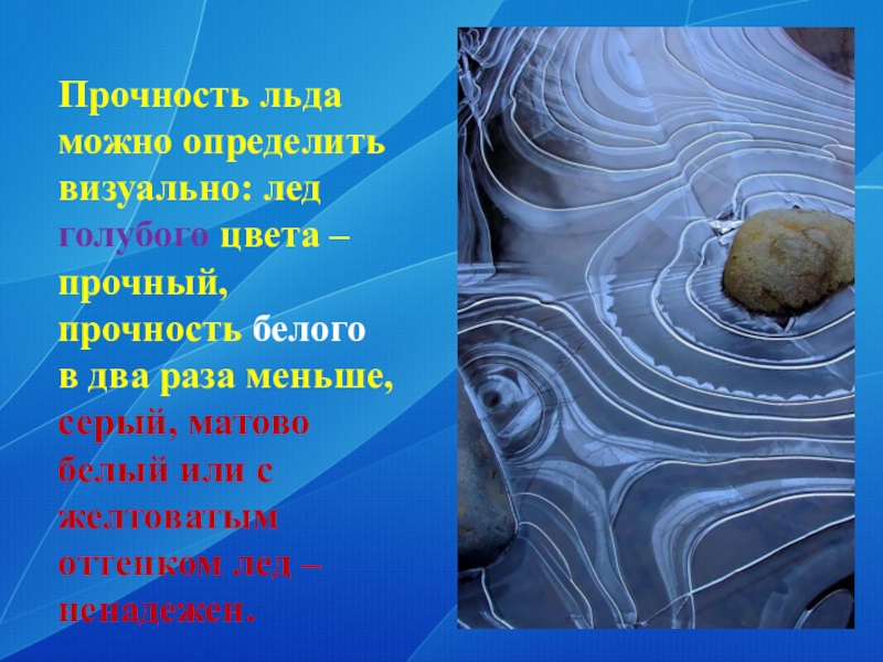 Слайд 12Прочность льда можно определить визуально: лед голубого цвета – прочный, прочность