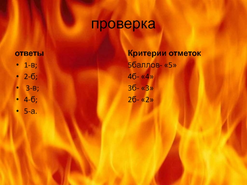 проверкаответы1-в;2-б; 3-в;4-б;5-а.Критерии отметок5баллов- «5»4б- «4»3б- «3»2б- «2»