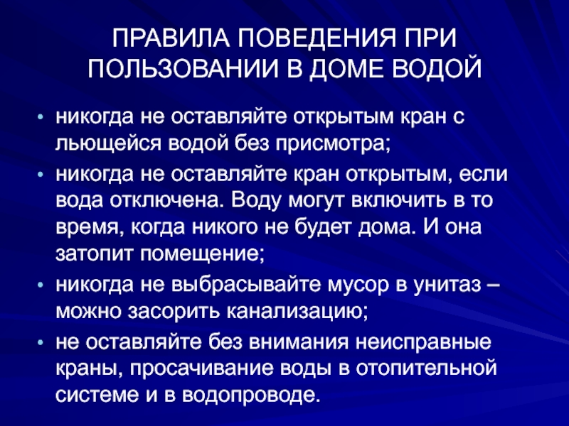ПРАВИЛА ПОВЕДЕНИЯ ПРИ ПОЛЬЗОВАНИИ В ДОМЕ ВОДОЙникогда не оставляйте открытым кран с льющейся водой без присмотра;никогда не