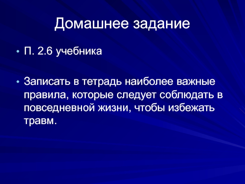 Домашнее заданиеП. 2.6 учебникаЗаписать в тетрадь наиболее важные правила, которые следует соблюдать в повседневной жизни, чтобы избежать
