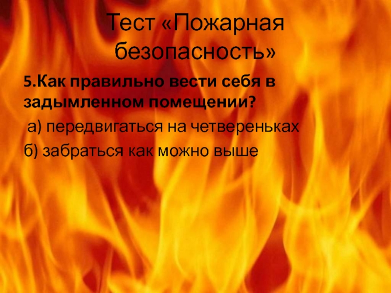 Тест «Пожарная безопасность»5.Как правильно вести себя в задымленном помещении? а) передвигаться на четверенькахб) забраться как можно выше