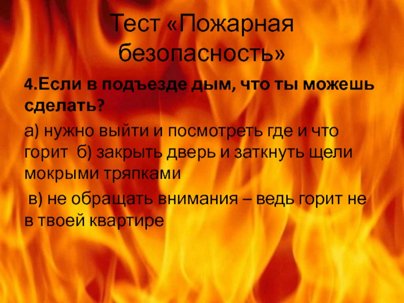 Тест «Пожарная безопасность»4.Если в подъезде дым, что ты можешь сделать?а) нужно выйти и посмотреть где и что