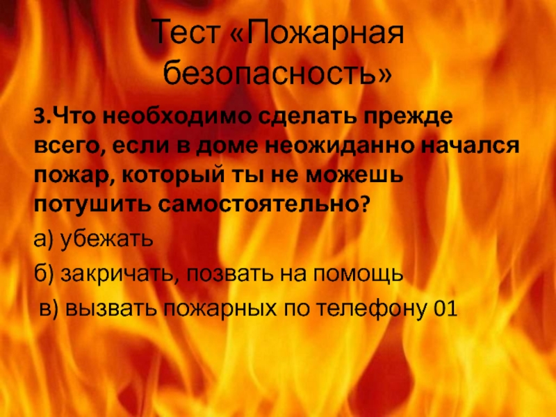 Тест «Пожарная безопасность»3.Что необходимо сделать прежде всего, если в доме неожиданно начался пожар, который ты не можешь потушить самостоятельно?а) убежатьб) закричать, позвать на помощь в) вызвать пожарных по телефону 01