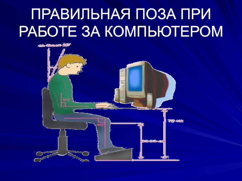 Слайд 13ПРАВИЛЬНАЯ ПОЗА ПРИ РАБОТЕ ЗА КОМПЬЮТЕРОМ
