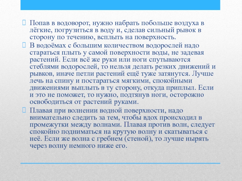 Слайд 9Попав в водоворот, нужно набрать побольше воздуха в лёгкие, погрузиться в