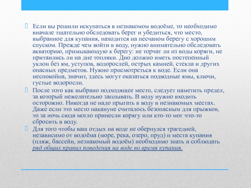 Слайд 4Если вы решили искупаться в незнакомом водоёме, то необходимо вначале тщательно