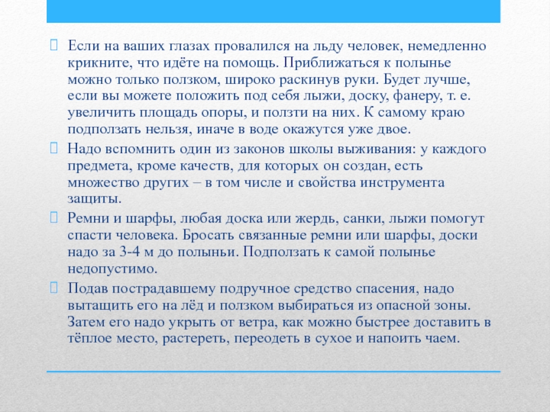Слайд 19Если на ваших глазах провалился на льду человек, немедленно крикните, что