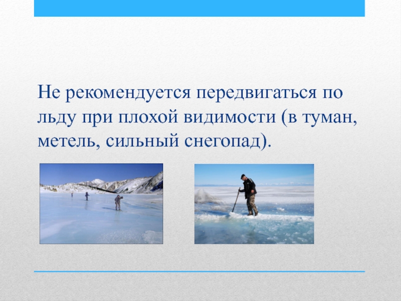 Слайд 17Не рекомендуется передвигаться по льду при плохой видимости (в туман, метель,