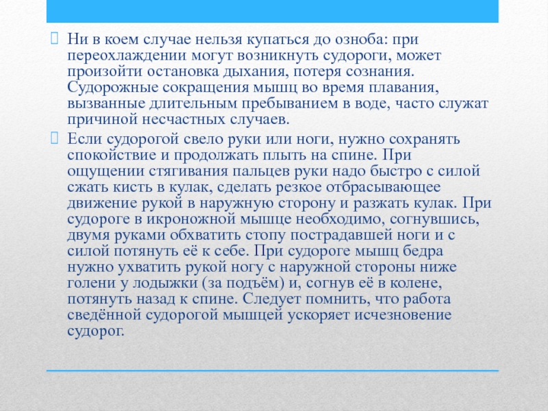 возникнуть судороги, может произойти остановка дыхания, потеря сознания. Судорожные сокращения мышц во время плавания, вызванные длительным пребыванием в воде, часто служат причиной несчастных случаев.
