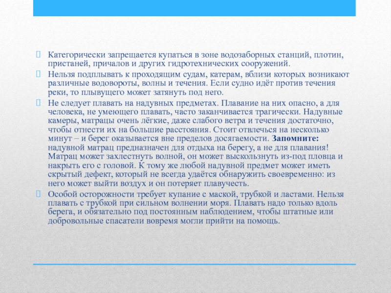 Не следует плавать на надувных предметах. Плавание на них опасно, а для человека, не умеющего плавать, часто заканчивается трагически. Надувные камеры, матрацы очень лёгкие, даже слабого ветра и течения достаточно, чтобы отнести их на большие расстояния. Стоит отвлечься на несколько минут – и берег оказывается вне пределов досягаемости. Запомните: надувной матрац предназначен для отдыха на берегу, а не для плавания! Матрац может захлестнуть волной, он может выскользнуть из-под пловца и накрыть его с головой. К тому же любой надувной предмет может иметь скрытый дефект, который не всегда удаётся обнаружить своевременно: из него может выйти воздух и он потеряет плавучесть.