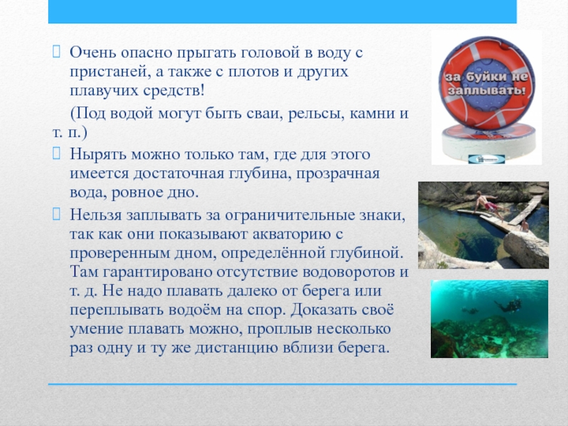 Слайд 11Очень опасно прыгать головой в воду с пристаней, а также с