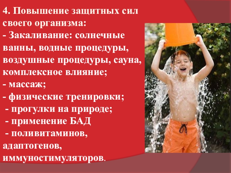 4. Повышение защитных сил своего организма:- Закаливание: солнечные ванны, водные процедуры, воздушные процедуры, сауна, комплексное влияние; -