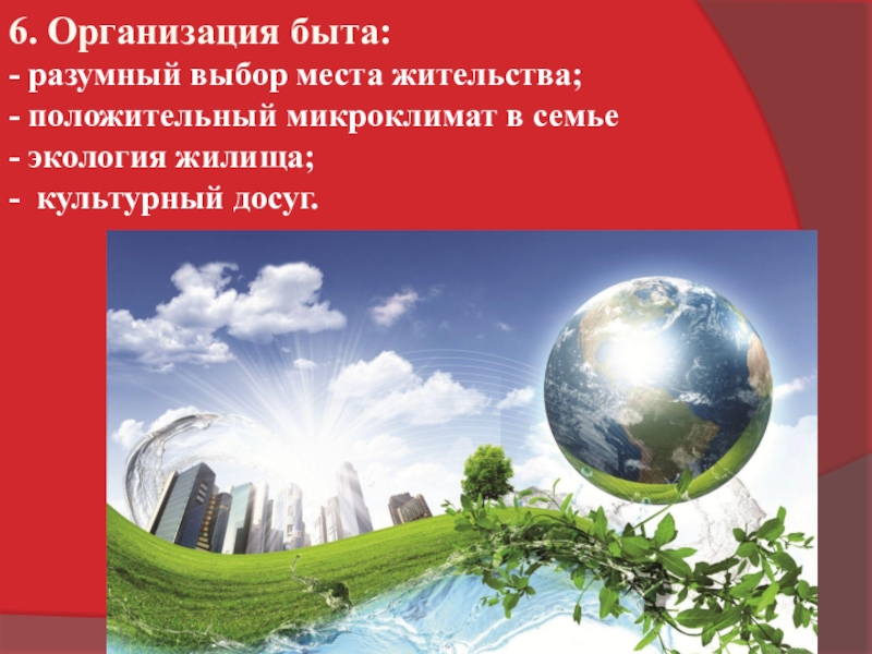 6. Организация быта:- разумный выбор места жительства;- положительный микроклимат в семье - экология жилища; - культурный досуг.