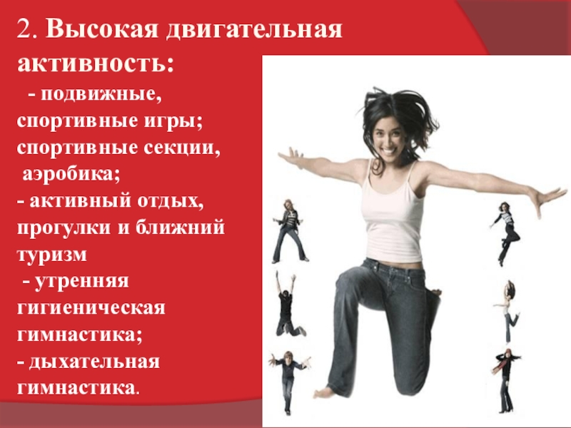 2. Высокая двигательная активность: - подвижные, спортивные игры; спортивные секции, аэробика; - активный отдых, прогулки и ближний