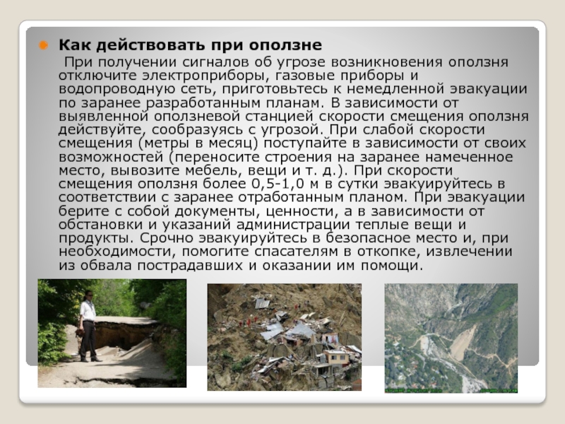 оползня отключите электроприборы, газовые приборы и водопроводную сеть, приготовьтесь к немедленной эвакуации по заранее разработанным планам. В зависимости от выявленной оползневой станцией скорости смещения оползня действуйте, сообразуясь с угрозой. При слабой скорости смещения (метры в месяц) поступайте в зависимости от своих возможностей (переносите строения на заранее намеченное место, вывозите мебель, вещи и т. д.). При скорости смещения оползня более 0,5-1,0 м в сутки эвакуируйтесь в соответствии с заранее отработанным планом. При эвакуации берите с собой документы, ценности, а в зависимости от обстановки и указаний администрации теплые вещи и продукты. Срочно эвакуируйтесь в безопасное место и, при необходимости, помогите спасателям в откопке, извлечении из обвала пострадавших и оказании им помощи.