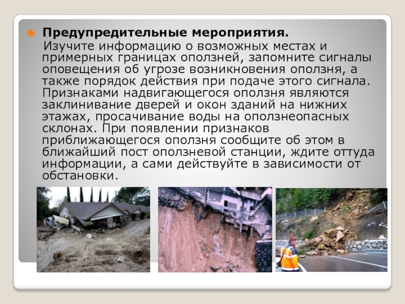 Предупредительные мероприятия.  Изучите информацию о возможных местах и примерных границах оползней, запомните сигналы оповещения об угрозе