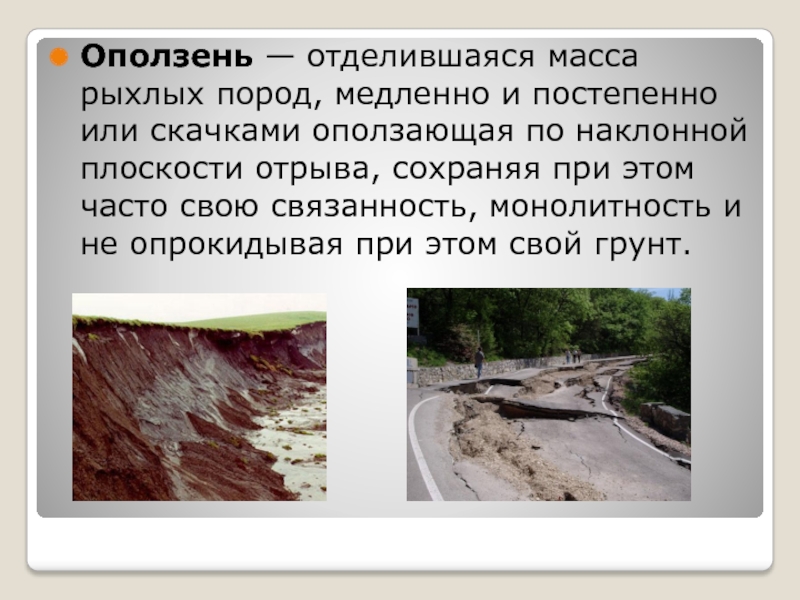 Слайд 2Оползень — отделившаяся масса рыхлых пород, медленно и постепенно или скачками оползающая по