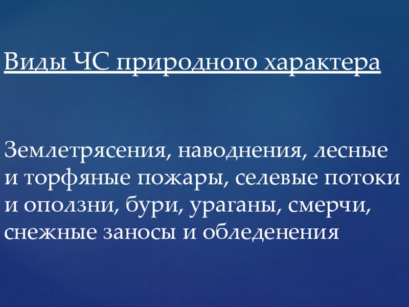 Слайд 3Виды ЧС природного характера Землетрясения, наводнения, лесные и торфяные пожары, селевые потоки