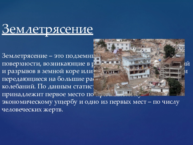 Землетрясение  Землетрясение – это подземные толчки и колебания земной поверхности, возникающие в результате внезапных смещений и