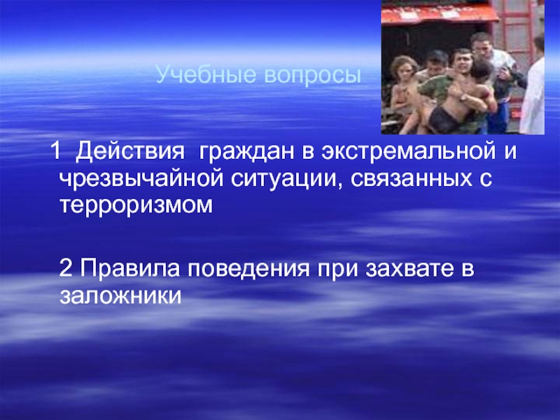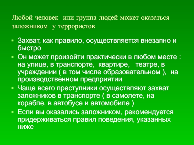 Слайд 26Любой человек или группа людей может оказаться заложником у террористов