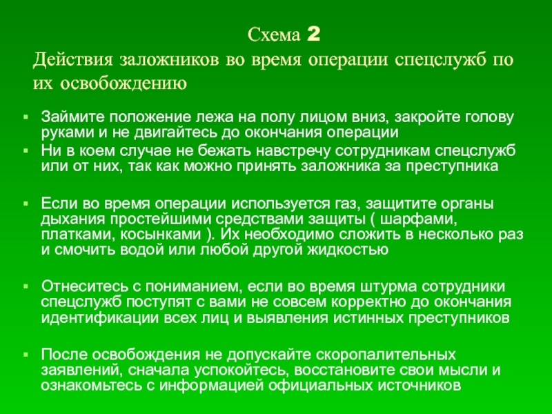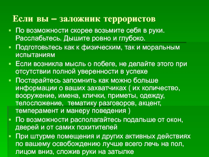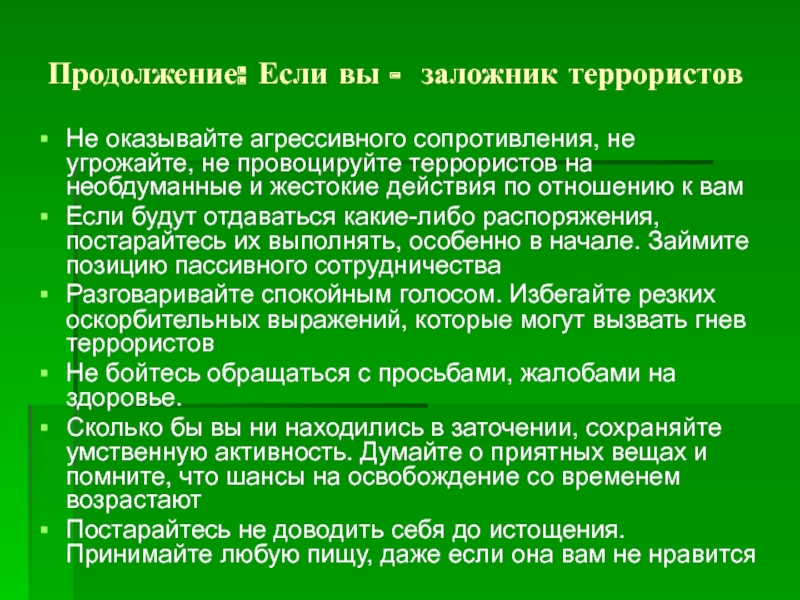Если вы оказались заложником, рекомендуется придерживаться правил поведения, указанных ниже