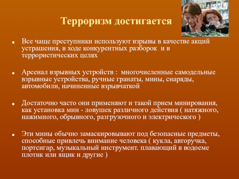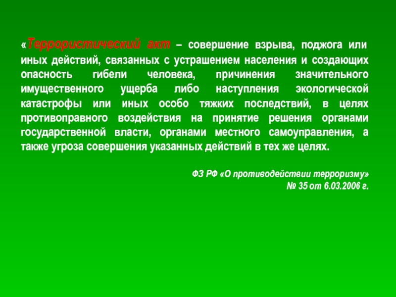 Слайд 5«Террористический акт – совершение взрыва, поджога или иных действий, связанных с
