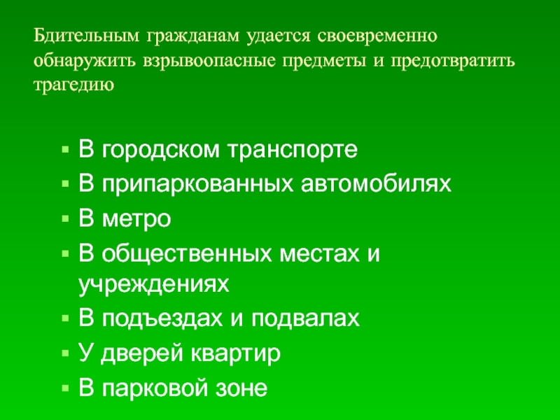 Слайд 10Бдительным гражданам удается своевременно обнаружить взрывоопасные предметы и предотвратить трагедию