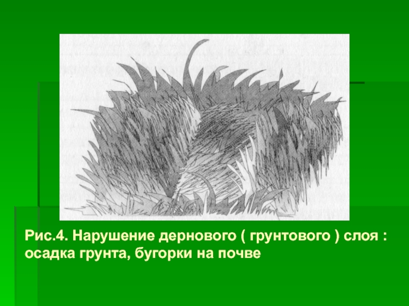 Слайд 15Рис.4. Нарушение дернового ( грунтового ) слоя : осадка грунта, бугорки