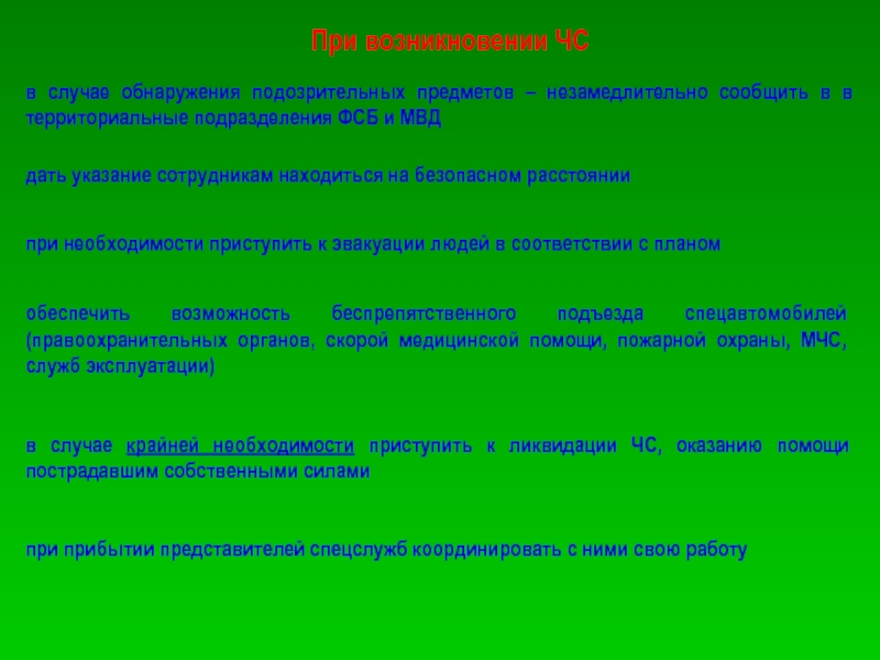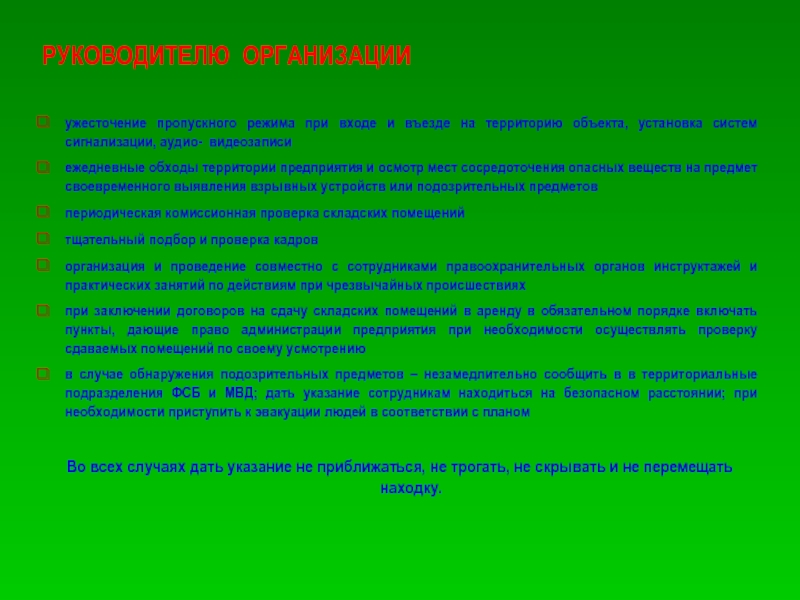 в случае обнаружения подозрительных предметов – незамедлительно сообщить в в территориальные подразделения ФСБ и МВД; дать указание сотрудникам находиться на безопасном расстоянии; при необходимости приступить к эвакуации людей в соответствии с планом