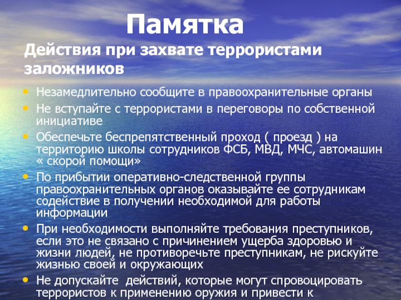 Не допускайте действий, которые могут спровоцировать террористов к применению оружия и привести к человеческим жертвам