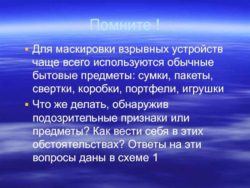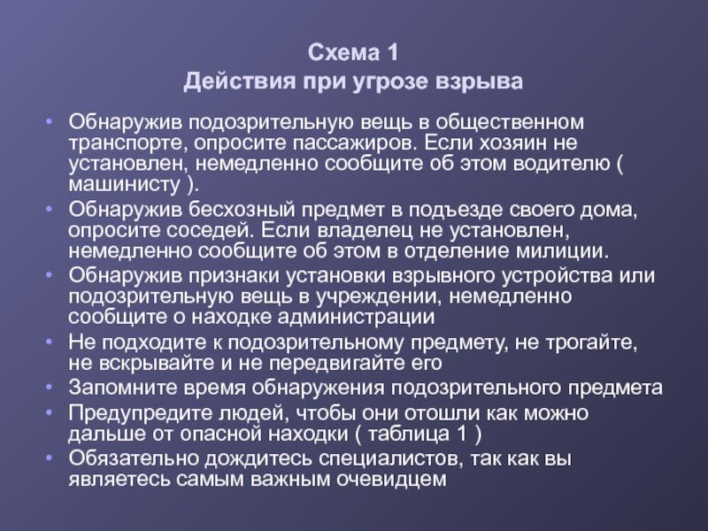 Что же делать, обнаружив подозрительные признаки или предметы? Как вести себя в этих обстоятельствах? Ответы на эти вопросы даны в схеме 1