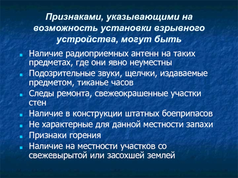 Слайд 16Признаками, указывающими на возможность установки взрывного устройства, могут быть
