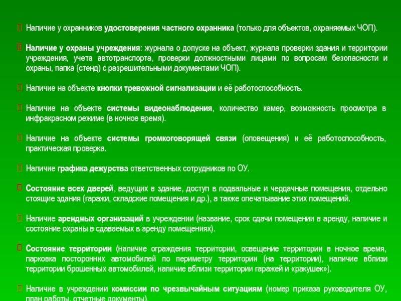 Слайд 35Наличие у охранников удостоверения частного охранника (только для объектов, охраняемых ЧОП).