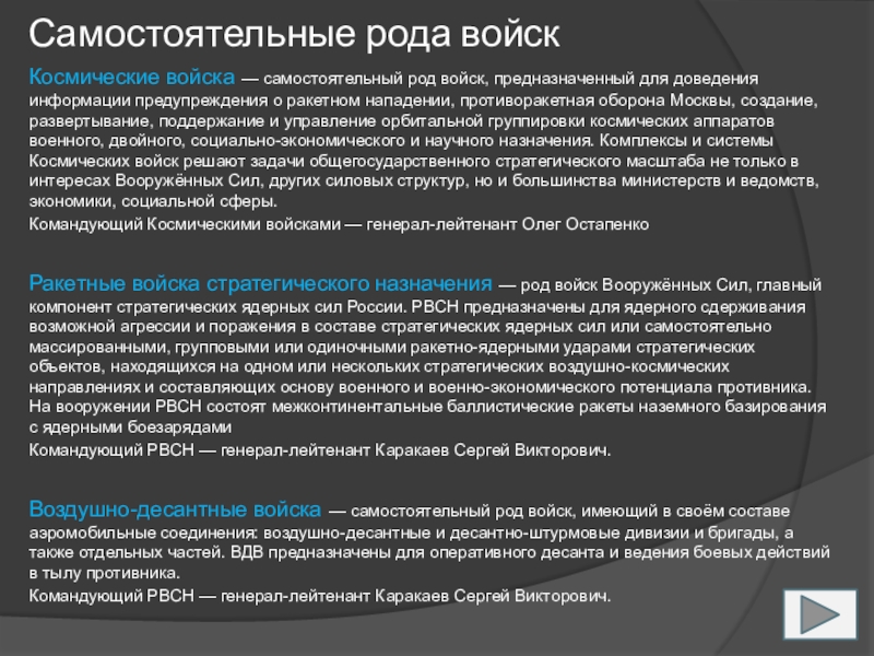 Космические войска — самостоятельный род войск, предназначенный для доведения