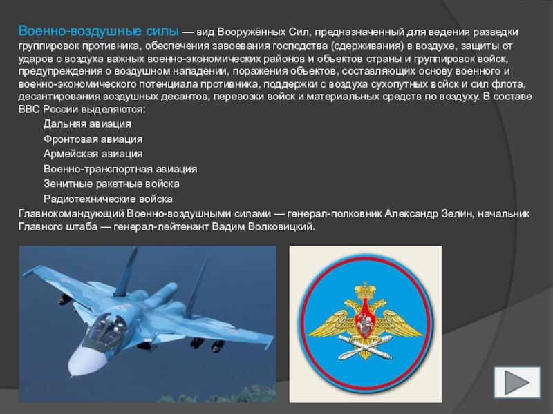Слайд 4Военно-воздушные силы — вид Вооружённых Сил, предназначенный для ведения разведки группировок