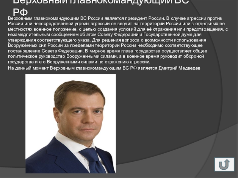 На данный момент Верховным главнокомандующим ВС РФ является Дмитрий Медведев